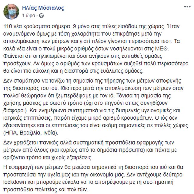 Ο κ. Μόσιαλος επισημαίνει μεν ότι δεν χρειάζεται πανικός μετά την ανακοίνωση των 110 νέων κρουσμάτων, τονίζει δε πως «δεν αντέχουμε δεύτερο lockdown και μπορούμε εύκολα να το αποτρέψουμε με τη συστηματική προσπάθεια πολιτείας και πολιτών».