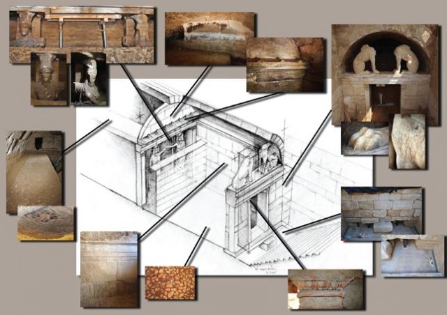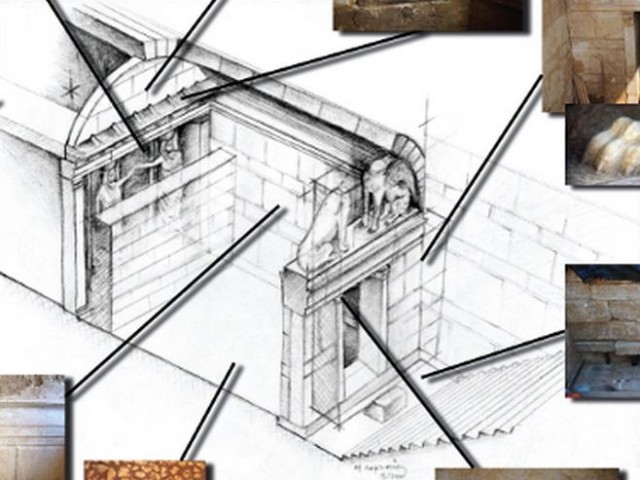 Πρόκειται για την πρώτη αξονομετρική σχεδιαστική αναπαράσταση του ταφικού μνημείου, από τον αρχιτέκτονα του ΥΠΠΟΑ κ. Μ. Λεφαντζή με τους δύο διαφραγματικούς τοίχους επί των οποίων φέρονται, στον μεν πρώτο οι Σφίγγες, στο δε δεύτερο οι Καρυάτιδες.