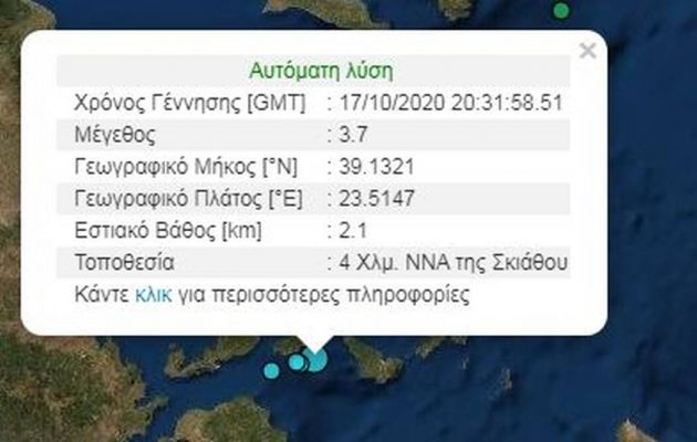 Το επίκεντρο του σεισμού εντοπίζεται 4 χλμ. νοτιοανατολικά της Σκιάθου.