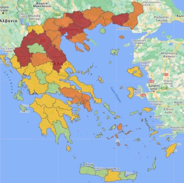Συγκεκριμένα οι περιφερειακές ενότητες της Θεσσαλονίκης, Λάρισας και Ροδόπης περνούν στο «κόκκινο», δηλαδή στο επίπεδο 4 (Αυξημένου Κινδύνου).