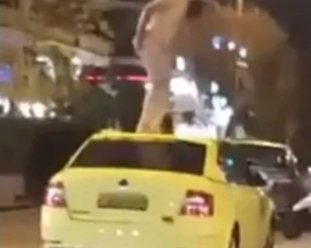 Όπως φαίνεται από την εικόνα που κυκλοφόρησε στο διαδίκτυο, ο άνδρας, ηλικίας περίπου 60 ετών, βγήκε «τσίτσιδος» στον δρόμο, ανέβηκε στην οροφή ενός ταξί και άρχισε να χοροπηδάει πάνω του.