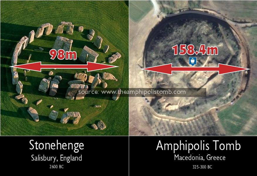 Το μνημείο είναι σχεδόν διπλάσιο από το Stonehenge, οι διαστάσεις του θυμίζουν μνημεία της Αιγύπτου. Δείτε στις εικόνες που ακολουθούν συγκριτικές κατόψεις του Τύμβου στην Αμφίπολη με άλλα διάσημα μνημεία.