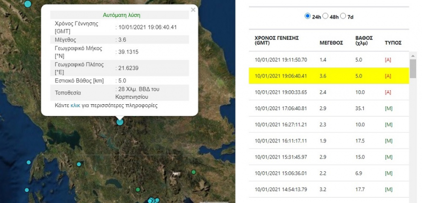 Ισχυρός σεισμός σημειώθηκε στις 21.06 το βράδυ της Κυριακής, με το επίκεντρό του να εντοπίζεται κοντά στο Καρπενήσι.