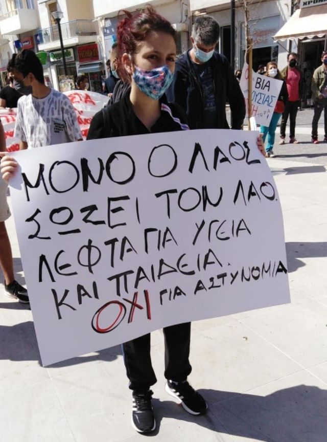 Στη δημοκρατική Κρήτη η καταστολή δεν περνάει. Μόνο ο λαός σώζει τον λαό, γράφει το πλακάτ της διαδηλώτριας στην Ιεράπετρα.