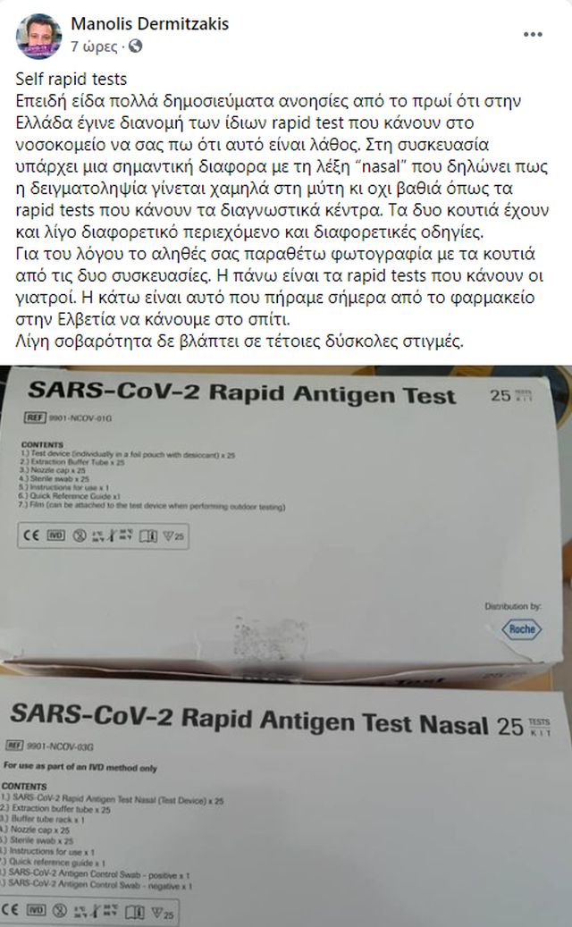 Συγκεκριμένα, ο καθηγητής παρέθεσε στην ανάρτησή του δύο πακέτα, ένα από τα οποία περιελάμβανε rapid test και ένα δεύτερο με self test, αποδεικνύοντας έτσι τη διαφορά στο περιεχόμενο των δύο κουτιών.