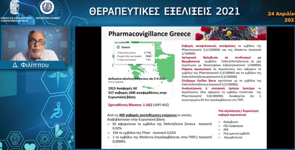 Tις παρενέργειες που έχουν τα 4 εμβόλια για τον κορωνοϊό παρουσίασε ο επίκουρος καθηγητής Ιατρικής ΕΚΠΑ, και πρόεδρος του ΕΟΦ, Δημήτρης Φιλίππου, που μίλησε στην ετήσια ημερίδα της Θεραπευτικής Κλινικής της Ιατρικής Σχολής παρουσιάζοντας κάποια χρήσιμα στοιχεία.