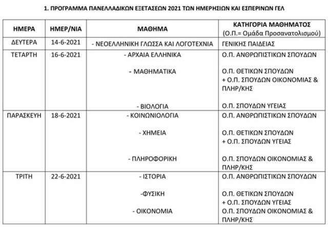 Από το υπουργείο Παιδείας και Θρησκευμάτων ανακοινώνεται ότι με υπουργικές αποφάσεις καθορίστηκε το πρόγραμμα των πανελλαδικών εξετάσεων των Γενικών Λυκείων και των Επαγγελματικών Λυκείων 2021.