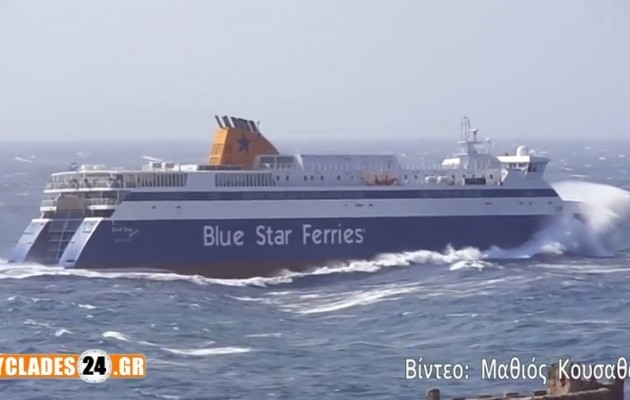 Ένα εντυπωσιακό βίντεο ανάρτησε το σάιτ cyclades24.gr από την Μύκονο, με το Blue Star Ithaki να δίνει επική μάχη με τα κύματα ανάμεσα στο στενό της Μυκόνου και της Τήνου, την Κυριακή 28 Σεπτεμβρίου.