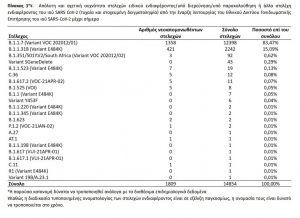 Από τα δείγματα αυτά, 24,64% αφορούν στο στέλεχος Β.1.1.7 (Variant VOC 202012/01), 61,12% στο B.1.1.318 (Variant E484K) και 3,32% στο B.1.351/501Y.V2 (Variant VOC 202012/02).