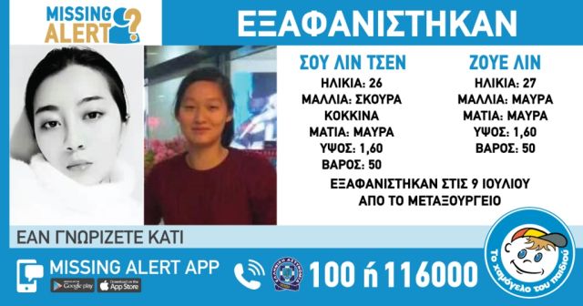 Δύο νεαρές γυναίκες ηλικίας 27 και 26 ετών κινεζικής καταγωγής εξαφανίστηκαν το πρωί της Παρασκευής από την περιοχή του Μεταξουργείου με αποτέλεσμα να ενεργοποιηθεί missing alert.