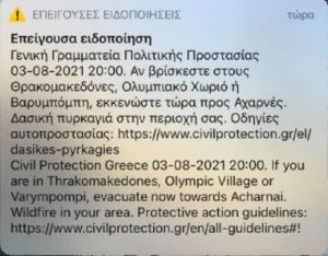 Όπως αναφέρεται στο μήνυμα όλοι όσοι βρίσκονται σε Θρακομακεδόνες, Βαρυμπόμπη και Ολυμπιακό Χωριό πρέπει να εκκενώσουν προς Αχαρνές.