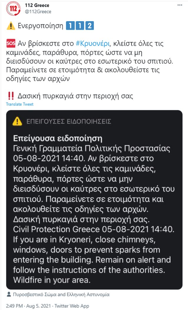 Συναγερμός έχει σημάνει για την περιοχή του Κρυονερίου, με τις Αρχές να έχουν διακόψει την κυκλοφορία στους δρόμους που οδηγούν στην κοινότητα.