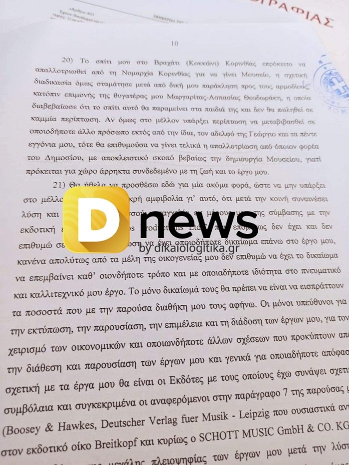 «Στην αγαπημένη μου κόρη Μαργαρίτα – Ασπασία Θεοδωράκη υπενθυμίζω όσα ήδη επί δεκαετίες της παρείχα εν ζωή, σε χρήματα και ακίνητα, όπως (ενδεικτικά) για την κάλυψη του συνόλου των εξόδων των επαγγελματικών της πρωτοβουλιών και δραστηριοτήτων, για τη διαβίωση της ίδιας και της οικογένειάς της, τον εξοπλισμό και τη συντήρηση των σπιτιών και των γραφείων της, για την ανατροφή, την εκπαίδευση και την οικονομική ενίσχυση των αγαπημένων τεσσάρων εγγονών μου και υιών της, για την απόκτηση όλων των ακινήτων και λοιπών περιουσιακών στοιχείων, που κατά καιρούς περιήλθαν στο όνομά της είτε απ’ ευθείας από εμένα είτε με δικά μου εξ ολοκλήρου χρήματα, καθώς και το μεγάλο ποσοστό από τις απολαβές από την εκμετάλλευση του έργου μου, που εισέπραττε επί πολλά έτη και εξακολουθεί να εισπράττει όσο ζω.