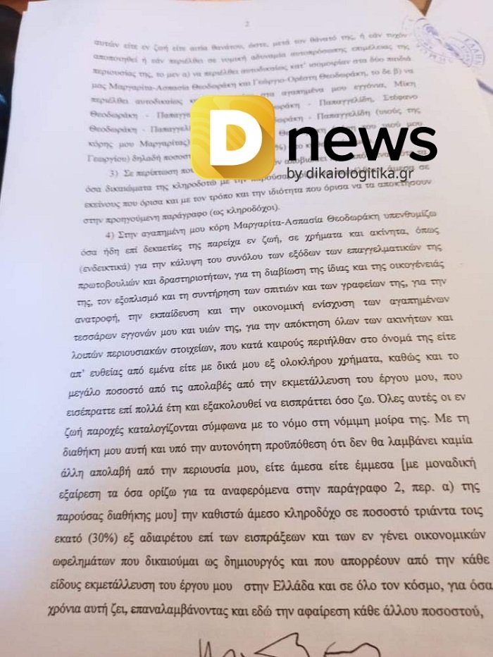 «Με τη διαθήκη μου αυτή και υπό την αυτονόητη προϋπόθεση ότι δεν θα λαμβάνει καμία άλλη απολαβή από την περιουσία μου, είτε άμεσα είτε έμμεσα (με μοναδική εξαίρεση τα όσα ορίζω για τα αναφερόμενα στην παράγραφο 2, περ. α) της παρούσας διαθήκης μου) την καθιστώ άμεσο κληροδόχο σε ποσοστό τριάντα τοις εκατό (30%) εξ αδιαιρέτου επί των εισπράξεων και των εν γένει οικονομικών ωφελημάτων που δικαιούμαι ως δημιουργός και που απορρέουν από την κάθε είδους εκμετάλλευση του έργου μου στην Ελλάδα και σε όλο τον κόσμο, για όσα χρόνια αυτή ζει, επαναλαμβάνοντας και εδώ την αφαίρεση κάθε άλλου ποσοστού» συμπληρώνει.