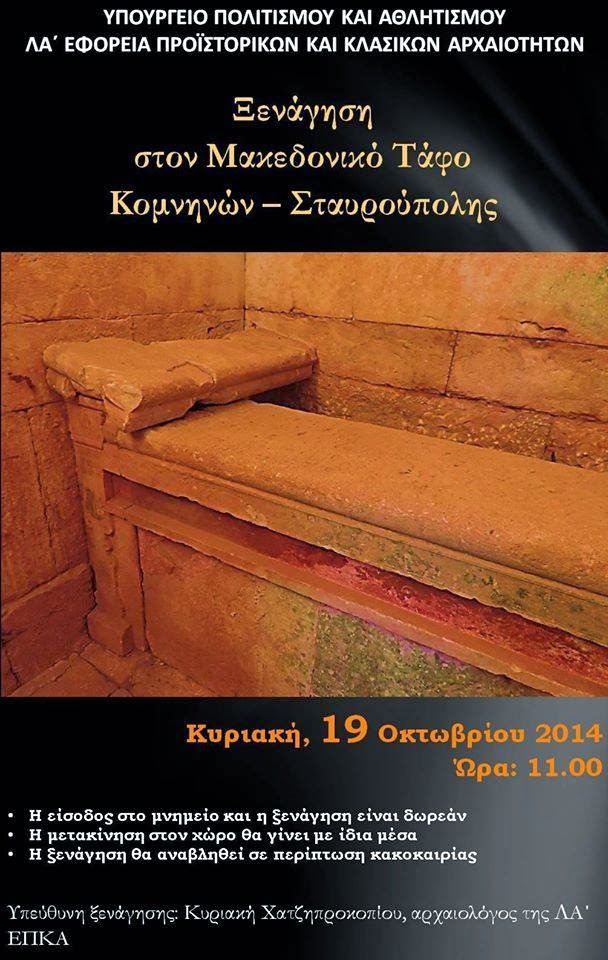 Στο πλαίσιο της εβδομάδας δράσεων και ευαισθητοποίησης της κοινής γνώμης στο έργο και την προσφορά της Αρχαιολογικής Υπηρεσίας που διοργανώνει ο Σύλλογος Ελλήνων Αρχαιολόγων ο Μακεδονικός Τάφος θα ανοίξει τις πόρτες του για το κοινό το πρωί της Κυριακής στις 11.00 οπότε και θα πραγματοποιηθεί ξενάγηση, ενώ ταυτόχρονα θα διανεμηθεί έντυπο ενημερωτικό υλικό για το μνημείο.