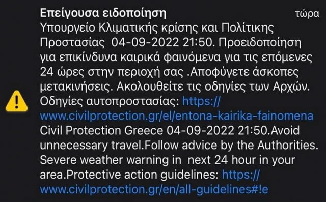 Προειδοποίηση για επικίνδυνα καιρικά φαινόμενα για τις επόμενες 24 ώρες στην περιοχή σας. Αποφύγετε άσκοπες μετακινήσεις.Ακολουθείτε τις οδηγίες των Αρχών.