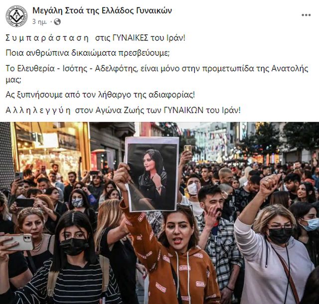 Η Μεγάλη Στοά της Ελλάδος Γυναικών κάλεσε σε συμπαράσταση και αλληλεγγύη στις αγωνιζόμενες γυναίκες του Ιράν. Σε ανάρτησή της στα μέσα κοινωνικής δικτύωσης, έγραψε: