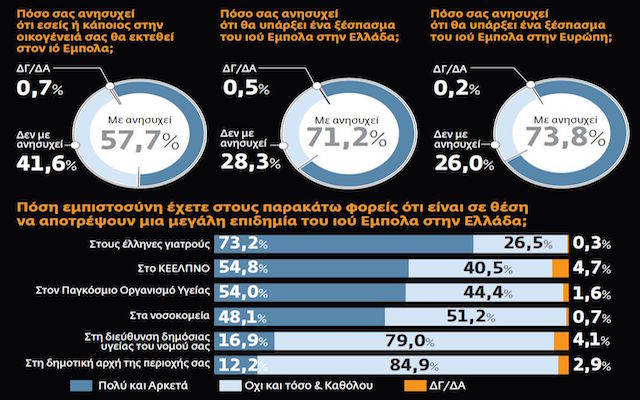 Περισσότεροι από τους μισούς ερωτηθέντες δηλώνουν ότι ανησυχούν πολύ με τη σκέψη ότι κάποιος δικός τους μπορεί να εκτεθεί στον ιό. Εξίσου πολλοί όμως είναι και αυτοί οι οποίοι δείχνουν ατάραχοι, ίσως επειδή ο ιός δεν έχει απειλήσει ακόμη σοβαρά τη χώρα μας. Παρά ταύτα, η συντριπτική πλειοψηφία του κόσμου δηλώνει ότι επιθυμεί τη λήψη περισσότερων μέτρων πρόληψης στις πύλες εισόδου της χώρας. Την ίδια στιγμή, δηλώνει ότι έχει πολύ μεγάλη εμπιστοσύνη στους Έλληνες γιατρούς, στη δουλειά που κάνει το Κέντρο Ελέγχου και Πρόληψης Νοσημάτων (ΚΕΕΛΠΝΟ) και στον Παγκόσμιο Οργανισμό Υγείας (ΠΟΥ).