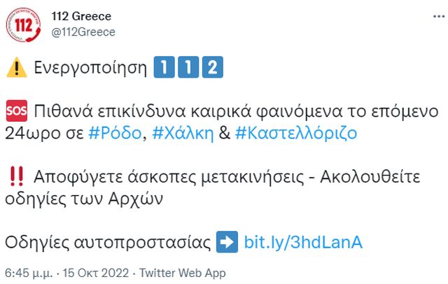 Έτσι μετά την Κάρπαθο και την Κάσο νέο μήνυμα του 112 στάλθηκε στους νησιώτες σε Ρόδο, Χάλκη και Καστελλόριζο λίγο πριν τις 19.00 του Σαββάτου.