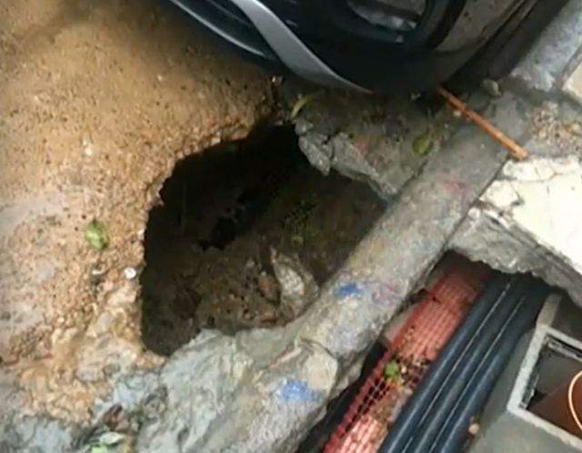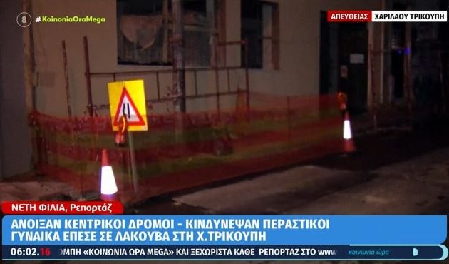 Στην οδό Χαριλάου Τρικούπη 98, χθες Πέμπτη το πρωί από την έντονη βροχή, το οδόστρωμα υποχώρησε, άνοιξε τρύπα, και η γυναίκα, που περνούσε από το σημείο έπεσε μέσα.