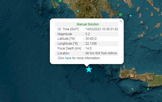 Σεισμός μεγέθους 5,2 βαθμών της κλίμακας Ρίχτερ σημειώθηκε το απόγευμα της Τρίτης (14/3) στις 18.36 στο θαλάσσιο χώρο κοντά στα Κύθηρα και την Κρήτη.