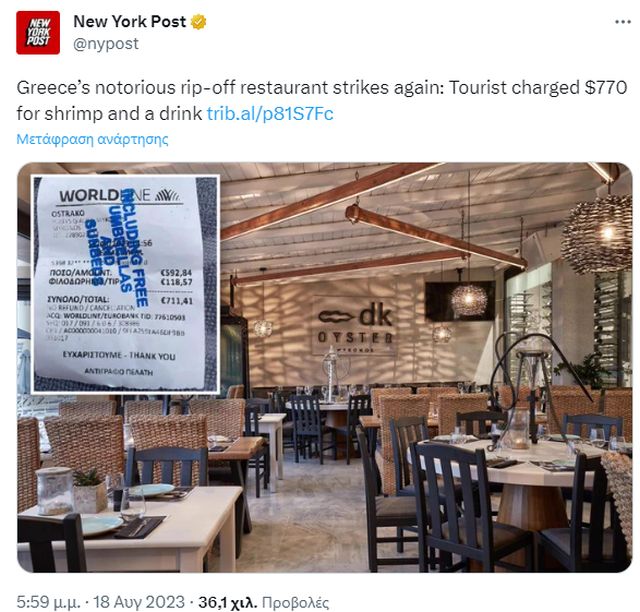 «Είναι οι μεγαλύτεροι απατεώνες και κλέφτες της Μυκόνου», φέρονται να έγραψαν οι πελάτες του εστιατορίου για την υποτιθέμενη εξαπάτησή του.