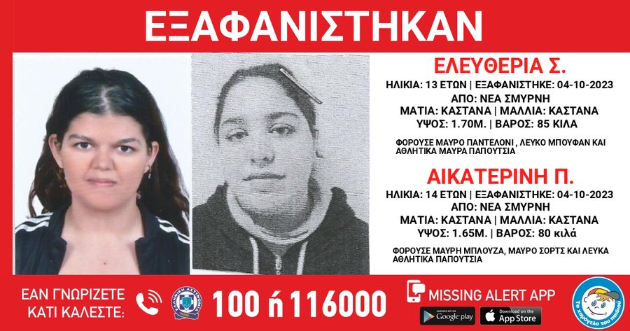 Συναγερμός στις Αρχές καθώς δύο ανήλικες, η 13χρονη Σ. και η 14χρονη Αικατερίνη Π., εξαφανίστηκαν από τη Μονάδα Κοινωνικής Φροντίδας Παιδόπολη «Αγία Βαρβάρα», στην περιοχή της Νέας Σμύρνης.