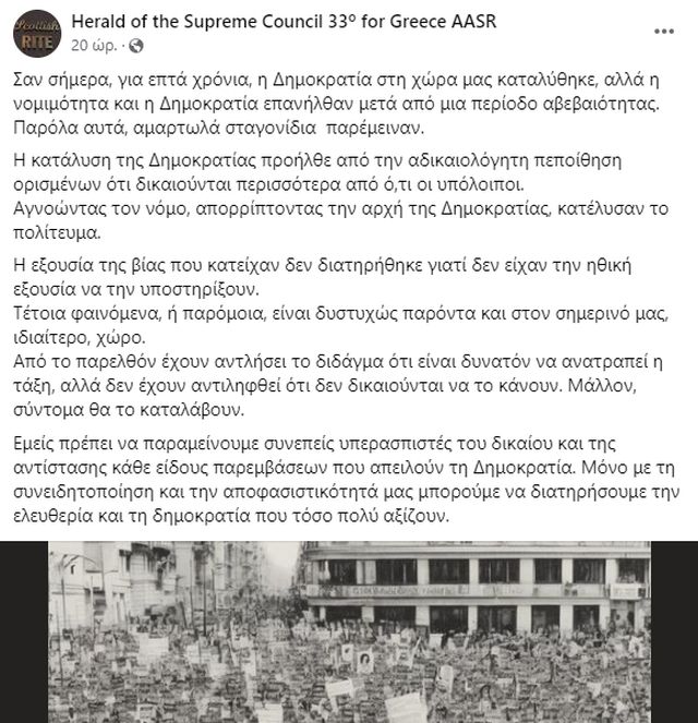 Ο Σκωτικός Τύπος (ΑΑΣΤ) δια την Ελλάδα, δηλαδή οι ανώτεροι βαθμοί (4-33) του Ελευθεροτεκτονισμού, την Κυριακή 21η Απριλίου, με αφορμή τη μαύρη επέτειο του πραξικοπήματος των Συνταγματαρχών, εξέδωσε την ακόλουθη ανακοίνωση, η οποία αναρτήθηκε στη σελίδα του Τάγματος στο Facebook: