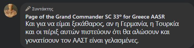 Ο Ύπατος Μεγάλος Ταξιάρχης του Σκωτικού Τύπου δια την Ελλάδα, Εμμανουήλ Γερακιός, με ανάρτησή του στο Facebook, υπό τον τίτλο «Η Σημασία των Διεθνών Σχέσεων στον Τεκτονισμό: Πλαίσιο, Όρια και Αρχές», ξεκαθαρίζει ορισμένα κρίσιμα ζητήματα. Σε συμπληρωματικό σχόλιο κάτω από την ανάρτηση, διατυπώνει με σαφήνεια: «Για να είμαι απόλυτα ξεκάθαρος, αν η Γερμανία, η Τουρκία και οι σύμμαχοί τους πιστεύουν ότι μπορούν να κυριαρχήσουν και να υποτάξουν τον ΑΑΣΤ, πλανώνται πλάνην οικτράν».