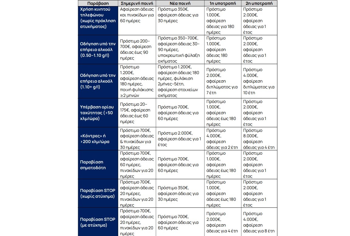 Στο πλαίσιο αυτό, σύμφωνα με κυβερνητικές πηγές, καθιερώνεται κλιμακωτού χαρακτήρα ποινολόγιο, ώστε να επιβάλλονται αυστηρότερες συνέπειες σε υπότροπους, οι οποίοι επαναλαμβάνουν σοβαρά παραπτώματα, ενώ υπάρχουν και πρόνοιες για αυξημένες κυρώσεις στην περίπτωση που ο παραβάτης εμπλακεί σε ατύχημα.