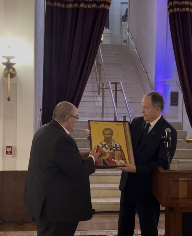 Ο Ύπατος Μέγας Ταξιάρχης (αριστερά) παρέδωσε εκ μέρους του Υπάτου Συμβουλίου της Ελλάδος το δώρο του προς τον Ύπατο της Νοτίου Δικαιοδοσίας (δεξιά): μία περίτεχνη βυζαντινή εικόνα του Αγίου Ιακώβου.