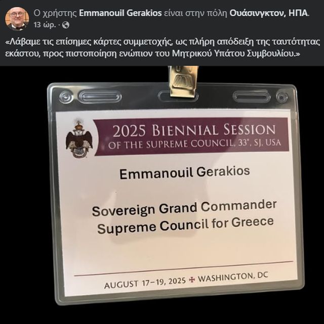 Υψηλόβαθμη αντιπροσωπεία του Υπάτου Συμβουλίου του Σκωτικού Τύπου του Ελευθεροτεκτονισμού για την Ελλάδα, υπό την ηγεσία του Ύπατου Μεγάλου Ταξιάρχη Εμμανουήλ Γερακιού, του Αρχαίου και Αποδεδεγμένου Σκωτικού Τύπου (ΑΑΣΤ) του Ελευθεροτεκτονισμού, βρίσκεται από το απόγευμα της 17ης Αυγούστου στην Ουάσιγκτον.