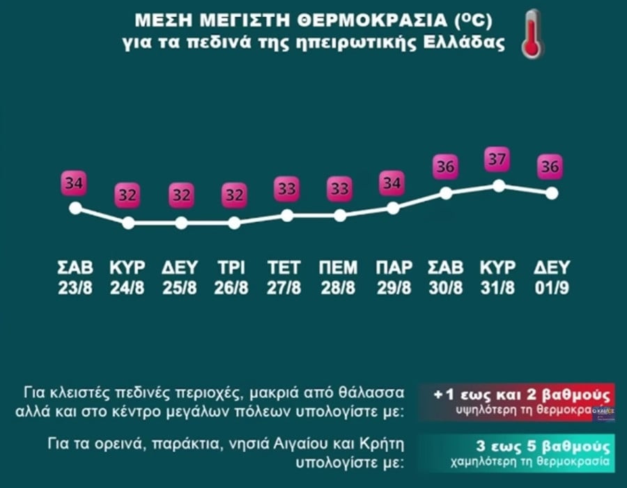 Η μέση μέγιστη θερμοκρασία στα πεδινά της ηπειρωτικής Ελλάδας θα φτάσει τους 36 με 37 βαθμούς Κελσίου και στις κλειστές πεδινές περιοχές, μακριά από τη θάλασσα, αλλά και στο κέντρο των μεγάλων πόλεων θα έχουμε έως και 39 βαθμούς.
