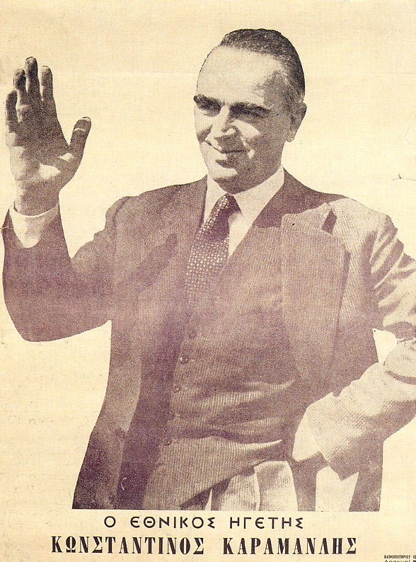 Στην αφίσα (Εικόνα) που κυκλοφορεί η ΕΡΕ, ο Κων. Καραμανλής εντυπωσιάζει με την φωτογραφία του. Για πρώτη φορά εμφανίζεται όρθιος με το χέρι ελεύθερο να χαιρετά. Το αριστερό χέρι στη μέση, αντικατοπτρίζει τη σιγουριά του ηγέτη. Με το βλέμμα του να εμπνέει τον δέκτη αισιοδοξία και αυτοπεποίθηση. Τα πατρικά μηνύματα που μεταφέρει η φωτογραφία τονίζονται από τον τίτλο «Ο Εθνικός ηγέτης»[1]. Η φράση αυτή συνέδεσε από εκείνη την εποχή μέχρι το τέλος της ζωής του, το πρόσωπο Καραμανλής με το προσωνύμιο «εθνάρχης»[2].