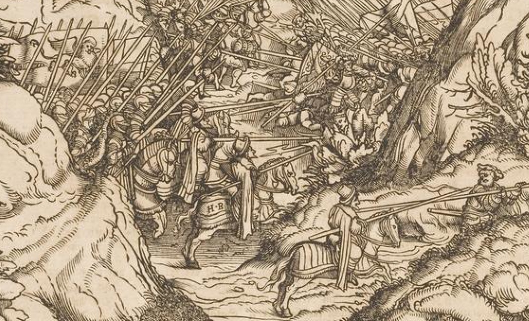 Έλληνες Στρατιώτες, ξεχωρίζουν από τα καπέλα τους, επιτίθενται μαζί με Δυτικούς ιππότες εναντίον των αντιπάλων τους. Οι Έλληνες στην εικόνα μάχονται υπό τη σημαία του Αγίου Μάρκου της Βενετίας.
