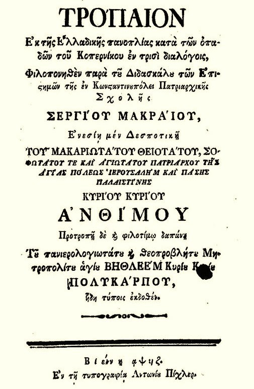 Έτσι, το έτος 1797 ο σχολάρχης της Πατριαρχικής Σχολής, Σέργιος Μακραίος, ανέλαβε τη «θεάρεστη» αποστολή για λογαριασμό της Ορθόδοξης Εκκλησίας να αποδείξει την ηλιοκεντρική θεωρία που είχε διατυπωθεί από τον Κοπέρνικο (2) ως λαθεμένη. Ο Σέργιος Μακραίος έθεσε μάλιστα σε κυκλοφορία ένα βιβλιαράκι με τούτο τον πομπώδη τίτλο, που από μόνος του μιλά για τη βλακεία του περιεχομένου: «Τρόπαιον κατά του Κοπερνικού συστήματος»!