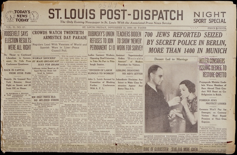 Τότε, το ναζιστικό καθεστώς στη Γερμανία πραγματοποίησε επιθέσεις εναντίον εβραϊκών στόχων πυρπολώντας τις περισσότερες από τις 1.200 συναγωγές της χώρας και βανδαλίζοντας χιλιάδες καταστήματα εβραϊκής ιδιοκτησίας.