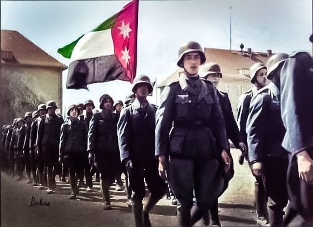 Ο Χατζ Αμίν αλ-Χουσεϊνί επιθεωρεί μουσουλμάνους SS. Τον Μάιο του 1943 οι πρώτοι 8.000 εθελοντές ορκίστηκαν αιώνια πίστη στον Αδόλφο Χίτλερ σύμφωνα με το τελετουργικό των SS.