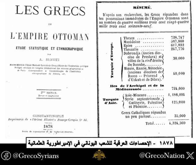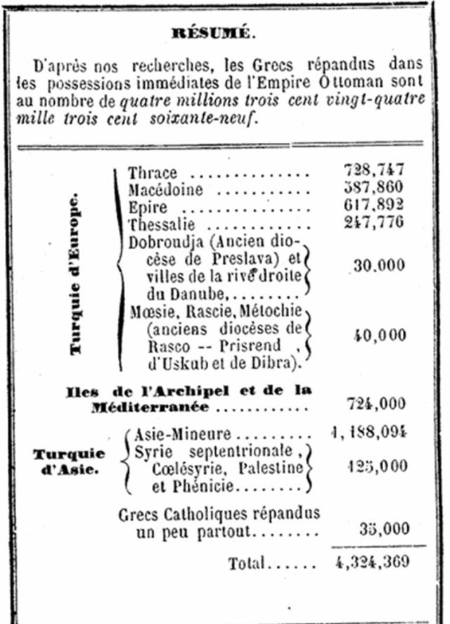 Το 1878, δημοσιεύθηκε στην Κωνσταντινούπολη μια σπάνια στατιστική και εθνογραφική μελέτη στη γαλλική γλώσσα, υπό τον τίτλο «Les Grecs de l’Empire Ottoman – Étude Statistique et Ethnographique» (Οι Έλληνες της Οθωμανικής Αυτοκρατορίας: Στατιστική και Εθνογραφική Μελέτη).