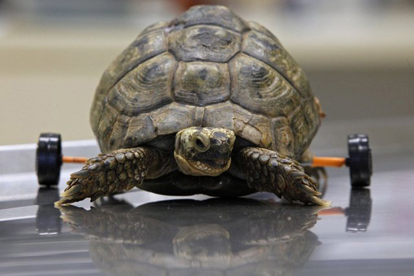 1) Η Τζβίκα είναι μια τραυματισμένη θηλυκή χελώνα. Υπέστη σοβαρές ζημιές στο καβούκι της όταν εκείνη είχε τρέξει πάνω με μια χορτοκοπτική μηχανή και έμεινε χωρίς πόδια. Βεβαίως τώρα, μπορεί να περπατήσει με τη βοήθεια των νέων “ποδιών” της που είναι δύο τροχοί.