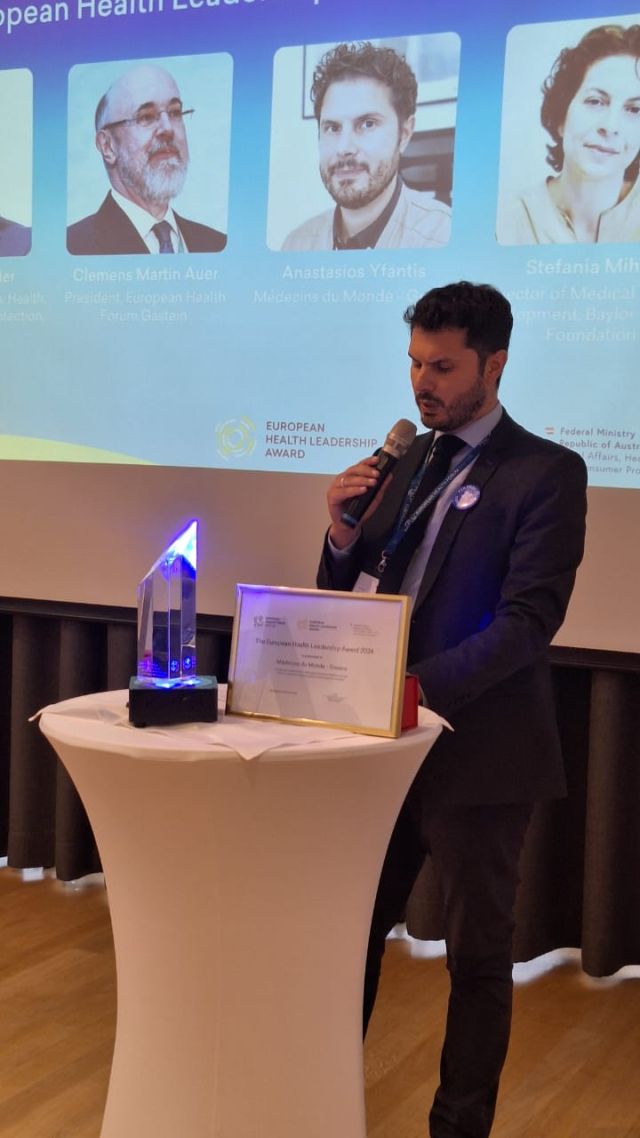 Παραλαμβάνοντας το βραβείο από τον εκπρόσωπο του υπουργείου Κοινωνικών Υποθέσεων, Υγείας, Φροντίδας και Προστασίας Καταναλωτών της Αυστρίας Stefan Eichwalder, ο Επιχειρησιακός Διευθυντής των Γιατρών του Κόσμου, Αναστάσιος Υφαντής, εξέφρασε την ευγνωμοσύνη της Οργάνωσης για την εξαιρετικά τιμητική αναγνώριση των μακροχρόνιων προσπαθειών της να βελτιώσει την πρόσβαση κοινωνικά ευάλωτων ομάδων και ειδικών πληθυσμών σε αξιοπρεπείς υπηρεσίες Υγείας.