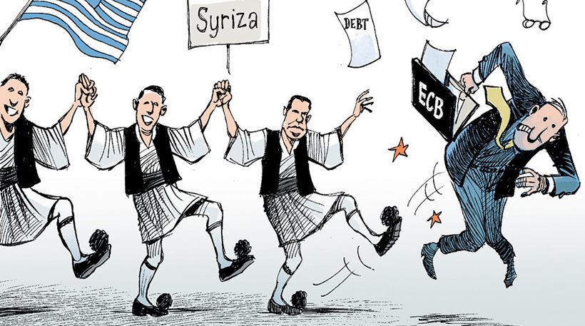 Τον γύρο των μέσων κοινωνικής δικτύωσης στον πλανήτη κάνει το σκίτσο της New York Times που δείχνει τους Έλληνες ντυμένους τσολιάδες να χορεύουν και να ρίχνουν κλωτσιά με το τσαρούχι στον τραπεζίτη της Ευρωπαϊκής Κεντρικής Τράπεζας.