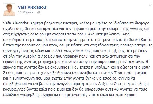 “Σήμερα βρήκα την ευκαιρία, καλές μου φίλες και διάβασα τα διάφορα σχόλια σας, θετικά και αρνητικά για την παρουσία μου στην εκπομπή της Αννίτας και σας ευχαριστώ όλες που με αγαπάτε τόσο πολύ. Ακούστε με λοιπόν. Από οποιαδήποτε περίπτωση και κατάσταση, να ξέρετε οτι μετράνε πάντα τα θετικα. Και τα θετικά της παρουσίας μου ήταν, οτι με είδατε, οτι σας έδωσα τρεις ωραίες νηστίσιμες συνταγές, που τις είδαν και πολλές νέες νοικοκυρές που δεν με ήξεραν, οτι με είδαν σε όλη την Αμερική φίλες μου που χάρηκαν πολύ, και οτι εγω αντιμετώπισα την ειρωνεία της Αννίτας με ψυχραιμία και έκανα άψογα την παρουσίαση των συνταγών. Η ειρωνεία της Αννίτας δεν με ακούμπησε. Που έπεσε η υπόληψη και η αξιοπρέπεια μου; Σ’ εσάς που με ξέρετε χρόνια; Αλίμονο αν συνέβαινε κάτι τέτοιο. Τόση είναι η αγάπη και η εμπιστοσύνη που μου έχετε; Στην Αννίτα βγήκα για εσάς και όχι για να προβληθώ και να ανεβάσω την αναγνωρισιμότητα μου. Δόξα τον θεό με ξέρει όλος ο κόσμος,γνωρίζοντας καλά ποια είμαι και δεν θα μπορούσαν ούτε 40 Αννίτες να τους αλλάξουν γνώμη. Σας ευχαριστώ που με αγαπάτε, να ‘στε καλά και καλό βράδυ”.