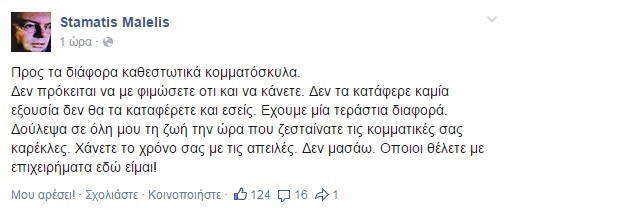 Δεν πρόκειται να με φιμώσετε ότι και να κάνετε. Δεν τα κατάφερε καμία εξουσία δεν θα τα καταφέρετε και εσείς. Έχουμε μία τεράστια διαφορά. Δούλεψα σε όλη μου τη ζωή την ώρα που ζεσταίνατε τις κομματικές σας καρέκλες. Χάνετε το χρόνο σας με τις απειλές. Δεν μασάω. Όποιοι θέλετε με επιχειρήματα εδώ είμαι!».