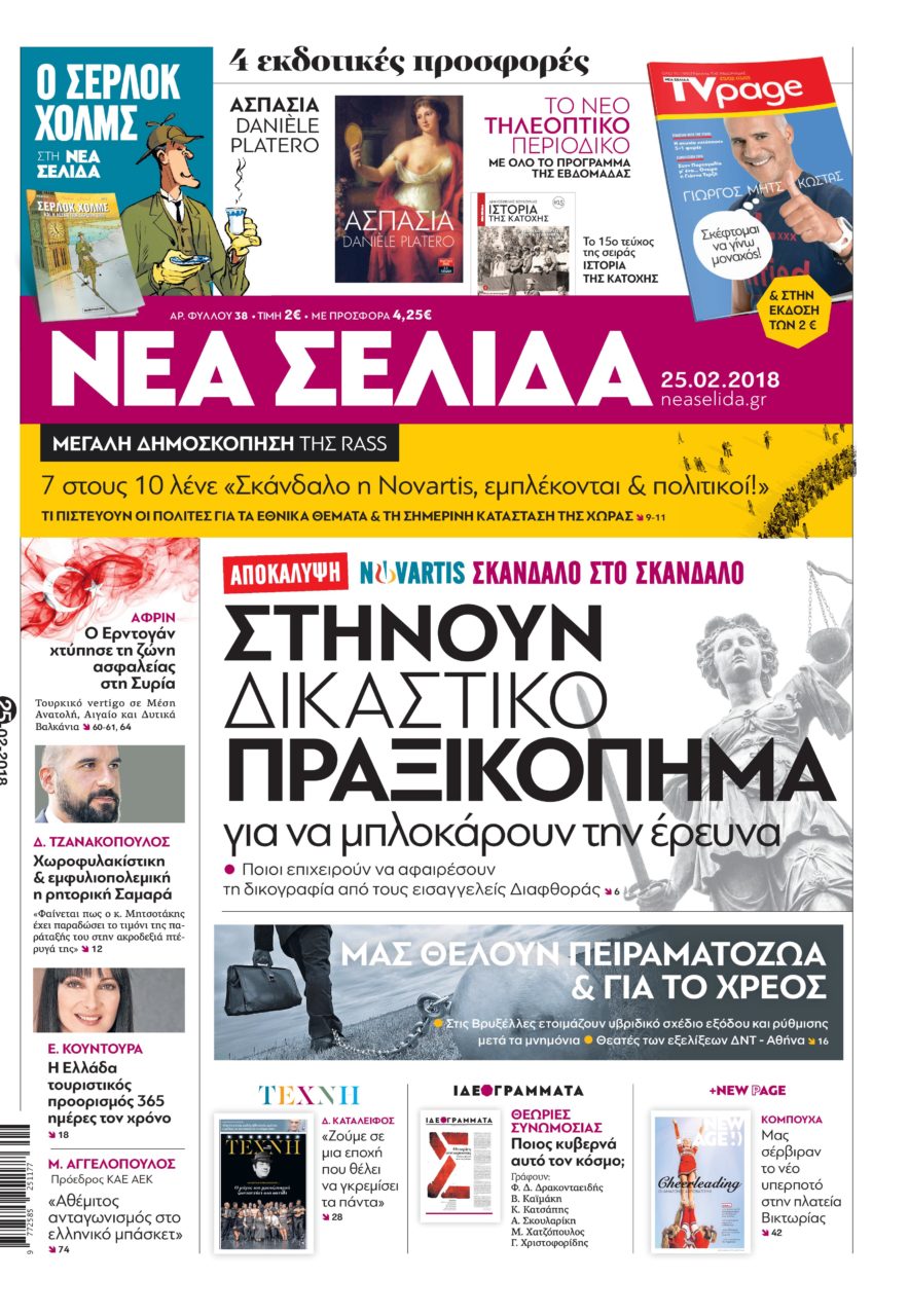 Με μια μεγάλη αποκάλυψη κυκλοφορεί η κυριακάτικη εφημερίδα «ΝΕΑ ΣΕΛΙΔΑ». Σε ρεπορτάζ που υπογράφει η Κατερίνα Ακριβοπούλου γίνεται λόγος για ένα «ιδιότυπο δικαστικό πραξικόπημα» που επιχειρείται στον χώρο της Δικαιοσύνης με επίκεντρο τη μεγάλη έρευνα για το σκάνδαλο της Novartis.