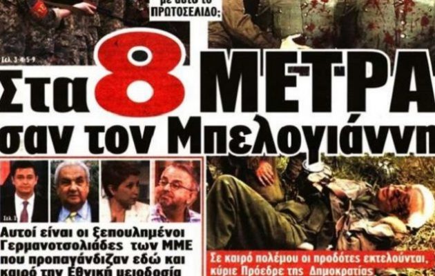 Το εν λόγω πρωτοσέλιδο, έχει τίτλο «Στα 8 μέτρα σαν τον Μπελογιάννη” υπέρτιτλο “Τα ανδρείκελα των δοσιλογισμού παρέδωσαν την Μακεδονία μας στους αλβανο – σλάβους με την ψευδεπίγραφη ονομασία “Βόρεια Μακεδονία” Παυλόπουλος – Τσίπρας – Κοτζιάς : εκτελεστικό απόσπασμα με μια σφαίρα στο κεφάλι για χαριστική βολή».