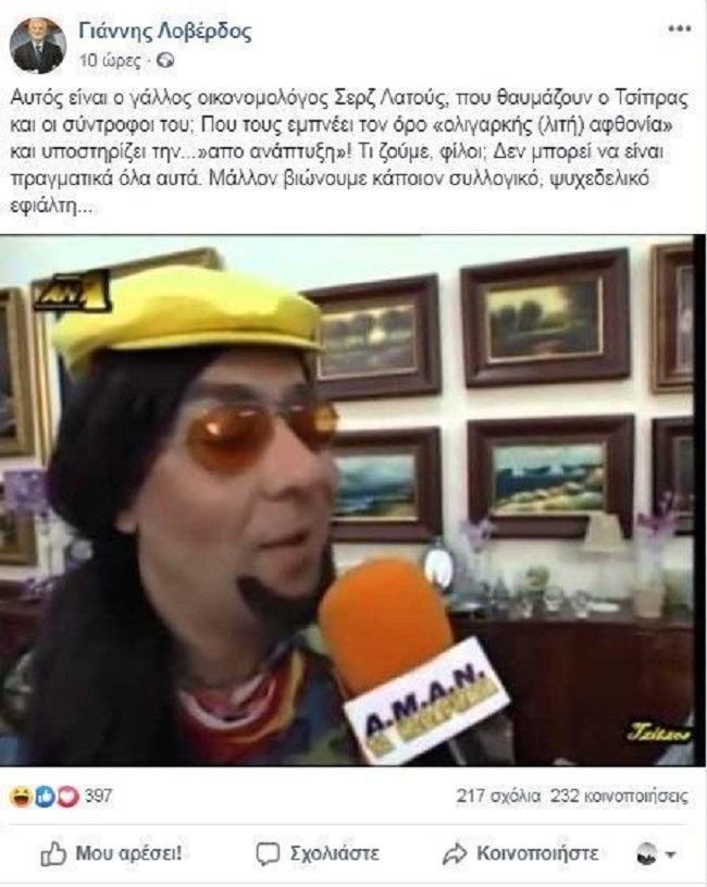 Τι έκανε; Αναφέρθηκε στο Facebook στον Γάλλο οικονομολόγο Σερζ Λατούς αναρτώντας φωτογραφία του… Σωτήρη Καλυβάτση.