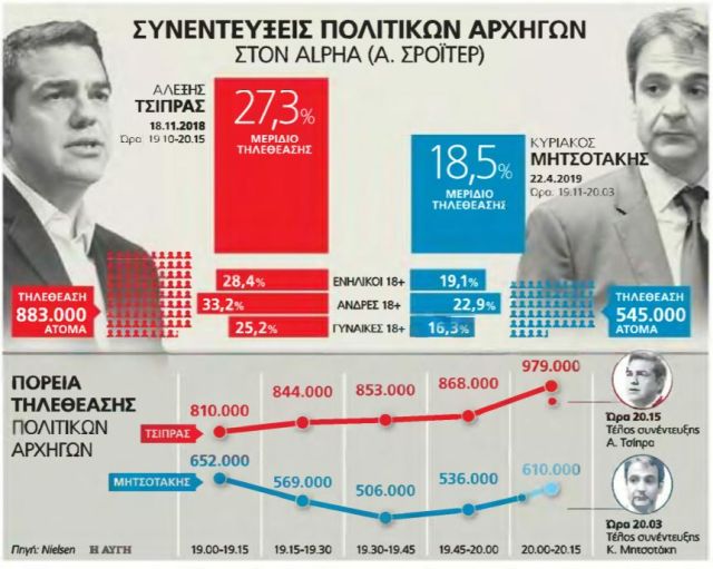 Είναι χαρακτηριστικό ότι τη συνέντευξη Μητσοτάκη την περασμένη Δευτέρα παρακολούθησαν μόλις 545.000 τηλεθεατές, ενώ λίγους μήνες πριν ο Αλέξης Τσίπρας από την ίδια θέση, στο ίδιο κανάλι, απαντώντας στις ερωτήσεις του ίδιου δημοσιογράφου, την ίδια ώρα, συγκέντρωσε 883.000 τηλεθεατές κατά μέσον όρο.