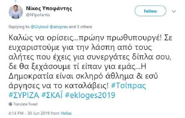 «Καλώς να ορίσεις…πρώην πρωθυπουργέ! Σε ευχαριστούμε για την λάσπη από τους αλήτες που έχεις για συνεργάτες δίπλα σου, δε θα ξεχάσουμε τί είπαν για εμάς…Η Δημοκρατία είναι σκληρό άθλημα & εσύ άργησες να το καταλάβεις! #Τσίπρας #ΣΥΡΙΖΑ #ΣΚΑΪ #ekloges2019».