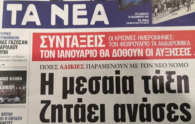 Η εφημερίδα ΤΑ ΝΕΑ με πρωτοσέλιδο της σήμερα Τρίτη κάνει σκληρή κριτική στην κυβέρνηση Μητσοτάκη κατηγορώντας την ότι με το φορολογικό νομοσχέδιο του Σταϊκούρα δεν υλοποιεί τις προεκλογικές της δεσμεύσεις για φορολογικές ελαφρύνσεις στην μεσαία τάξη.